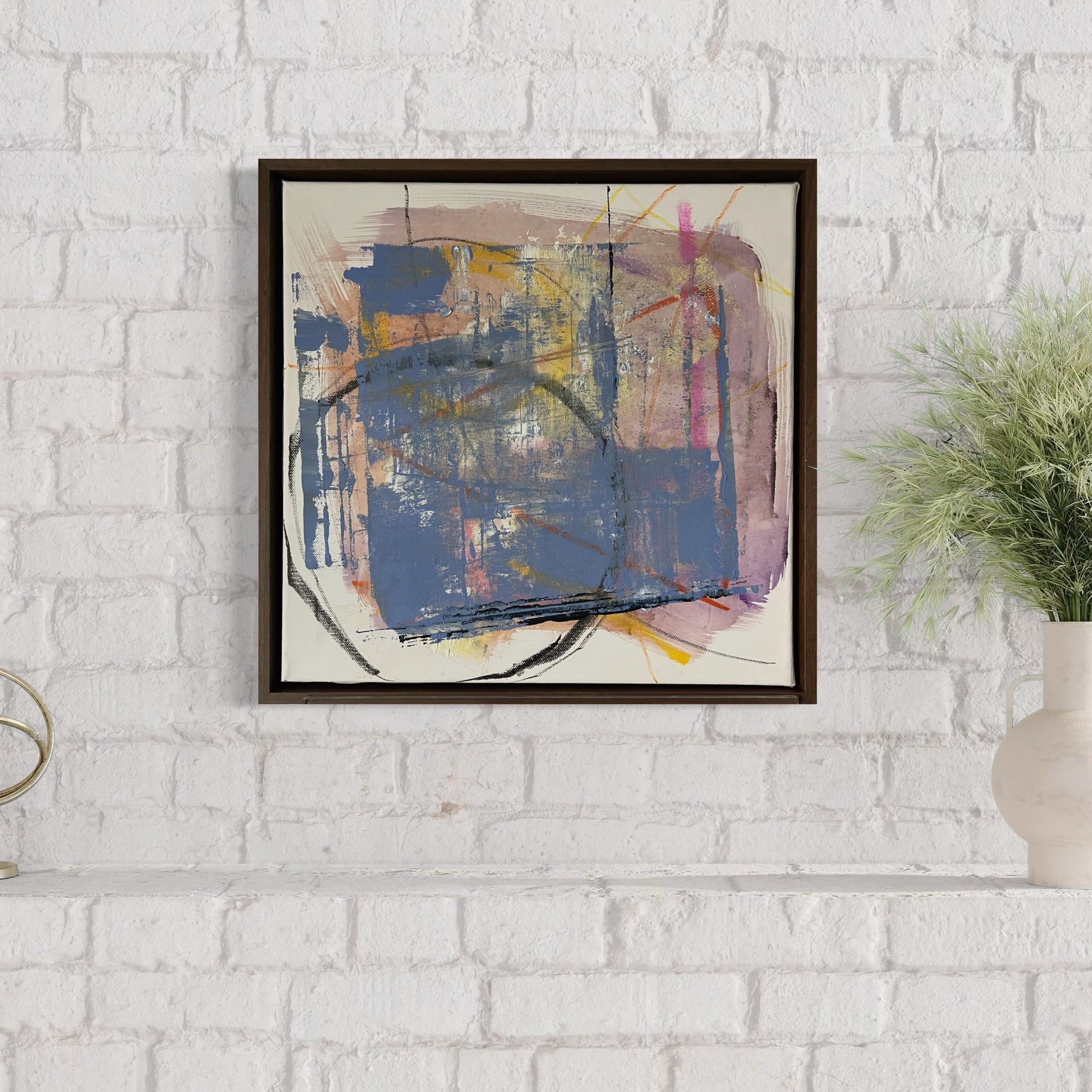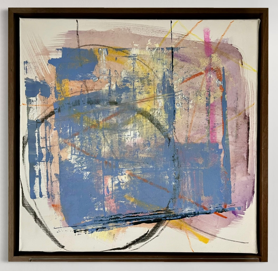 This piece is all about movement. Even in its soft pastel shades, there's a restless energy that keeps circling back. The shapes overlap and swirl like thoughts that won't sit still, creating a dance of colour and form.